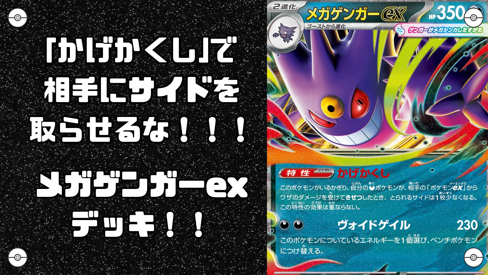 メガゲンガーexの特性:かげかくしで、相手の「ポケモンex」からワザのダメージを受けてきぜつしたとき、とられるサイドは1枚少なくなる為、基本的には非エクアタッカーを相手に押しつけて戦えれば、相手はサイドを取ることなくゲームが進んでいくことになります!!